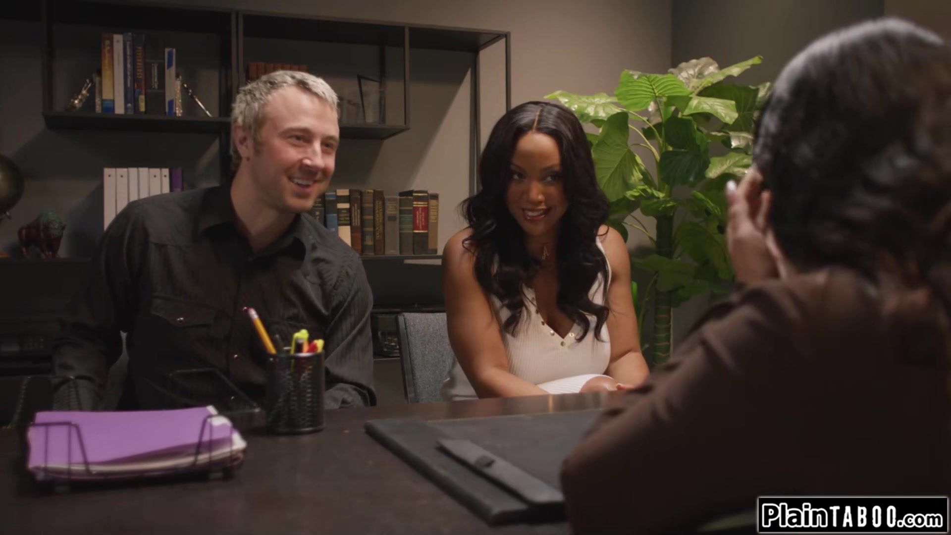 Busty ebony August Skye and her husband have a meet with the college counselor Princess Emily.Shes recognized as the unpopular girl at college who had a crush on her husband.She can fuck him for information.The brunette is facefucked while licked