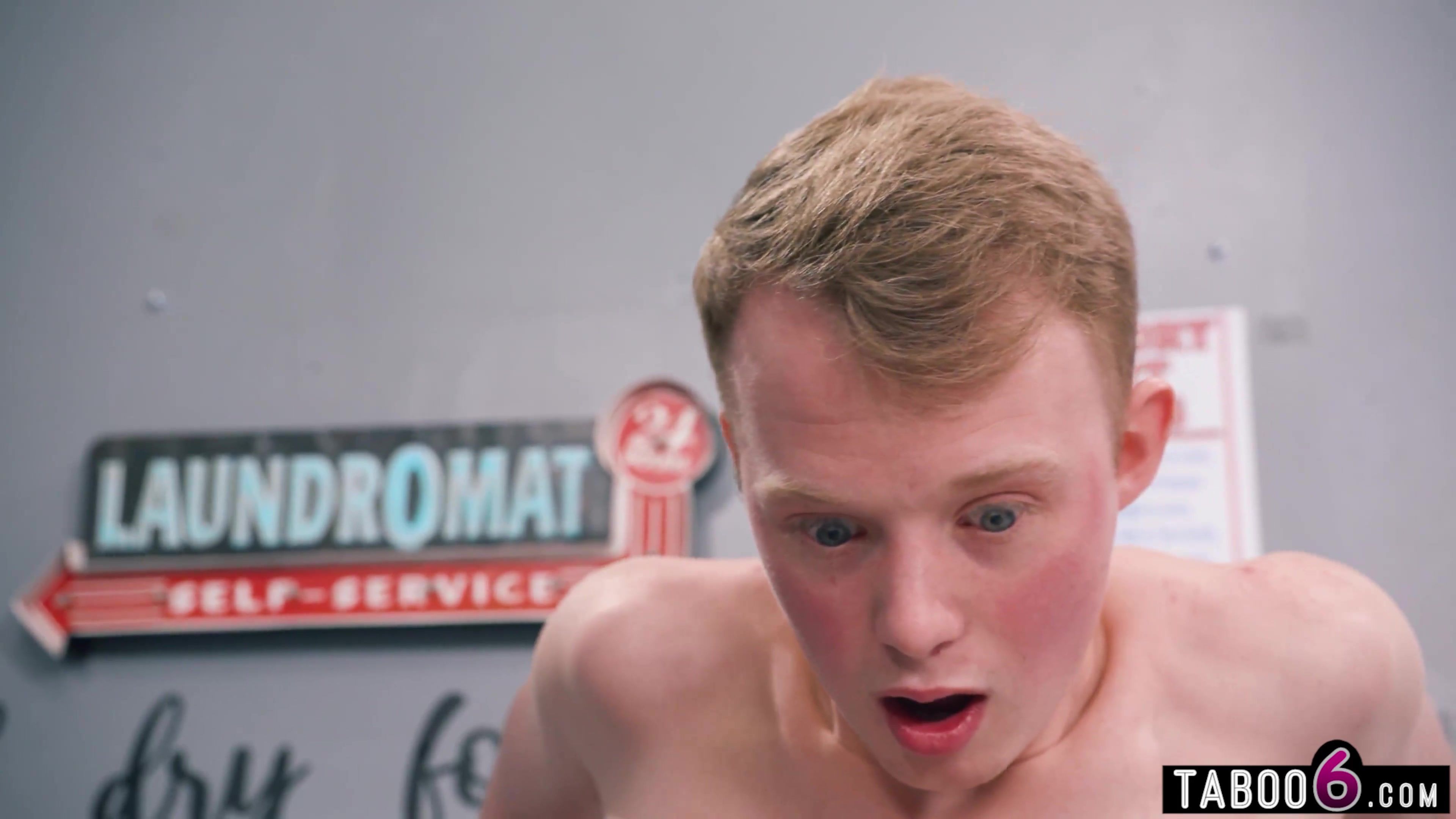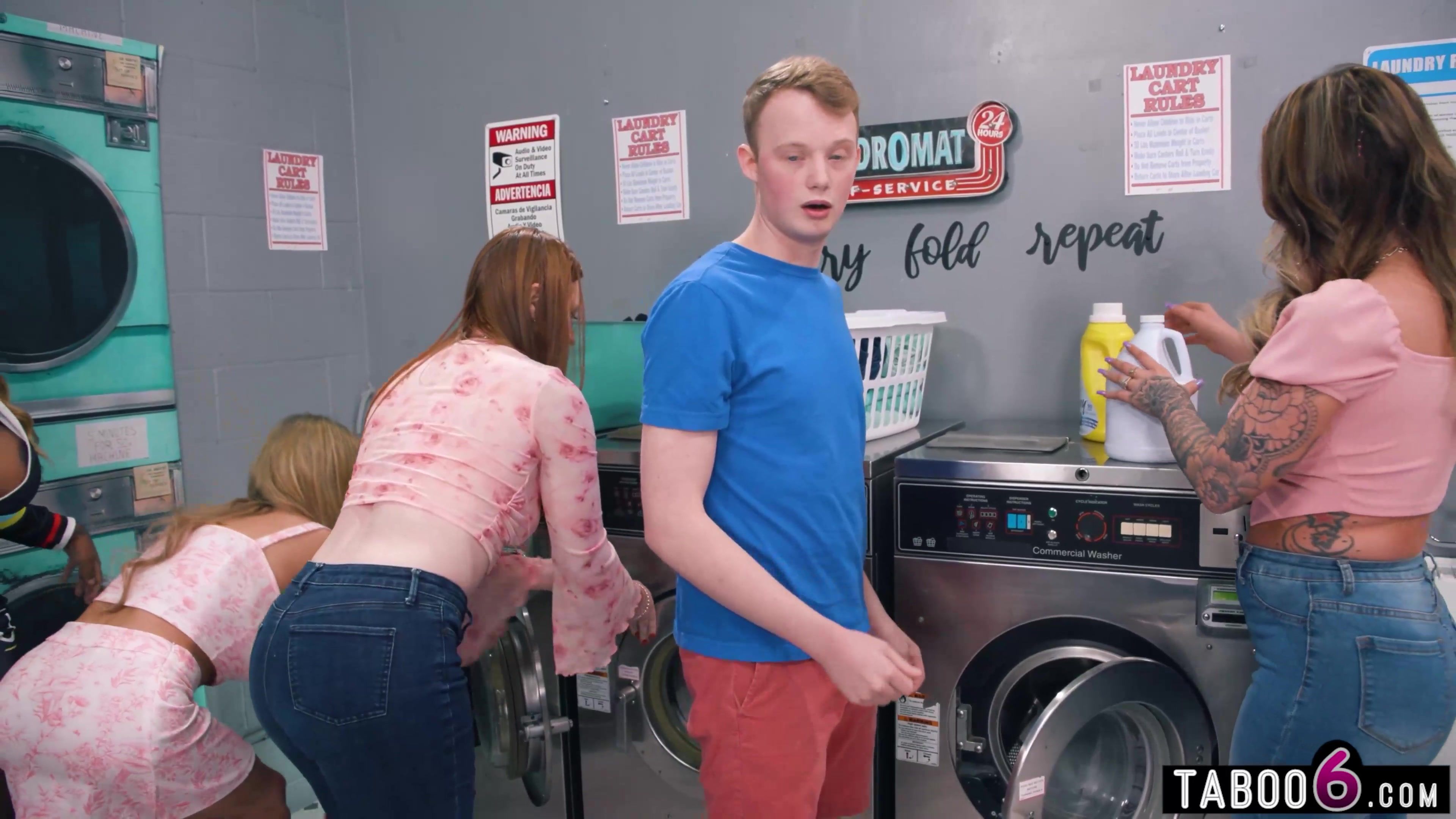 Young guy reverse gangbanged by hot MILFs in a laundry room